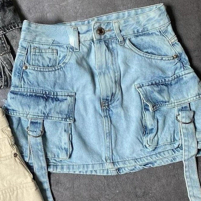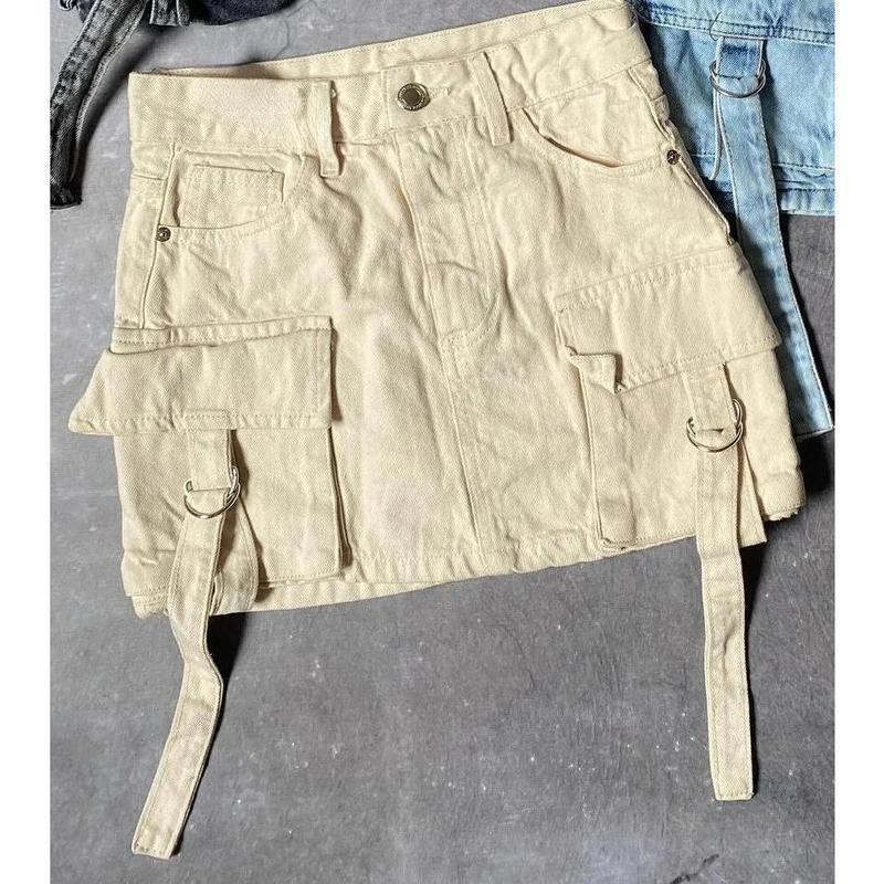Multiple Pockets Denim Plaid Skirt Vintage...